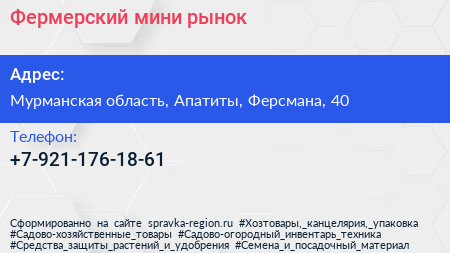 Фермерский, мини-рынок по адресу Мурманская область, Апатиты, Ферсмана, 40 в дальнейшем Организация, размещена в следующих категориях: