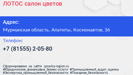ЛОТОС, салон цветов по адресу Мурманская область, Апатиты, Космонавтов, 36 в дальнейшем Организация, размещена в следующих категориях: