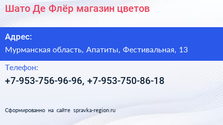 Шато Де Флёр, магазин цветов по адресу Мурманская область, Апатиты, Фестивальная, 13 в дальнейшем Организация, размещена в следующих категориях: