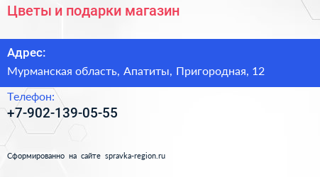 Цветы и подарки, магазин по адресу Мурманская область, Апатиты, Пригородная, 12 в дальнейшем Организация, размещена в следующих категориях: