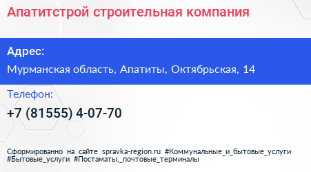 Апатитстрой, строительная компания по адресу Мурманская область, Апатиты, Октябрьская, 14 в дальнейшем Организация, размещена в следующих категориях: