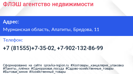 ФЛЭШ, агентство недвижимости по адресу Мурманская область, Апатиты, Бредова, 11 в дальнейшем Организация, размещена в следующих категориях: