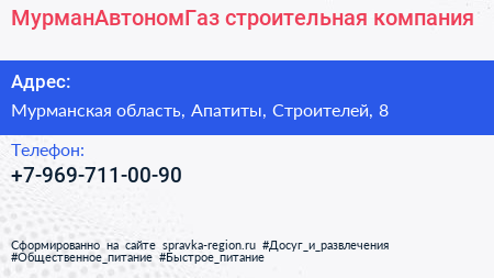 МурманАвтономГаз, строительная компания по адресу Мурманская область, Апатиты, Строителей, 8 в дальнейшем Организация, размещена в следующих категориях: