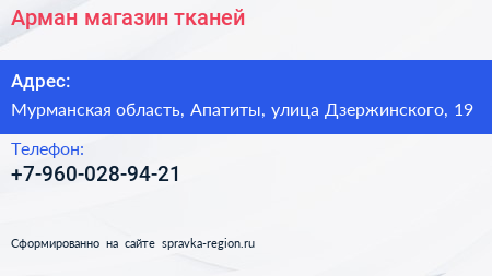 Арман, магазин тканей по адресу Мурманская область, Апатиты, улица Дзержинского, 19 в дальнейшем Организация, размещена в следующих категориях: