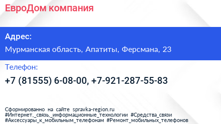 ЕвроДом, компания по адресу Мурманская область, Апатиты, Ферсмана, 23 в дальнейшем Организация, размещена в следующих категориях: