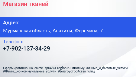 Магазин тканей по адресу Мурманская область, Апатиты, Ферсмана, 7 в дальнейшем Организация, размещена в следующих категориях: