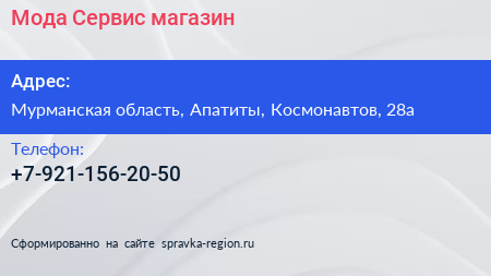 Мода Сервис, магазин по адресу Мурманская область, Апатиты, Космонавтов, 28а в дальнейшем Организация, размещена в следующих категориях: