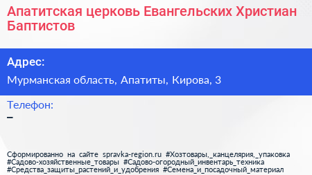 Апатитская церковь Евангельских Христиан-Баптистов по адресу Мурманская область, Апатиты, Кирова, 3 в дальнейшем Организация, размещена в следующих категориях: