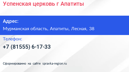 Успенская церковь г. Апатиты по адресу Мурманская область, Апатиты, Лесная, 38 в дальнейшем Организация, размещена в следующих категориях: