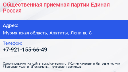 Общественная приемная партии Единая Россия по адресу Мурманская область, Апатиты, Ленина, 8 в дальнейшем Организация, размещена в следующих категориях: