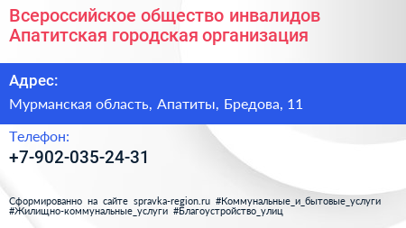 Всероссийское общество инвалидов, Апатитская городская организация по адресу Мурманская область, Апатиты, Бредова, 11 в дальнейшем Организация, размещена в следующих категориях: