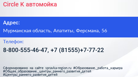 Circle K, автомойка по адресу Мурманская область, Апатиты, Ферсмана, 56 в дальнейшем Организация, размещена в следующих категориях: