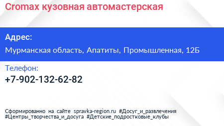 Cromax, кузовная автомастерская по адресу Мурманская область, Апатиты, Промышленная, 12Б в дальнейшем Организация, размещена в следующих категориях: