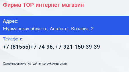 Фирма ТОР, интернет-магазин по адресу Мурманская область, Апатиты, Козлова, 2 в дальнейшем Организация, размещена в следующих категориях: