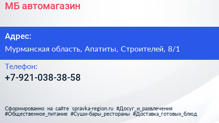 МБ, автомагазин по адресу Мурманская область, Апатиты, Строителей, 8/1 в дальнейшем Организация, размещена в следующих категориях: