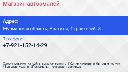 Магазин автоэмалей по адресу Мурманская область, Апатиты, Строителей, 8 в дальнейшем Организация, размещена в следующих категориях:
