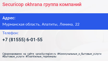 Securicop okhrana, группа компаний по адресу Мурманская область, Апатиты, Ленина, 22 в дальнейшем Организация, размещена в следующих категориях: