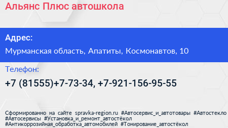 Альянс Плюс, автошкола по адресу Мурманская область, Апатиты, Космонавтов, 10 в дальнейшем Организация, размещена в следующих категориях: