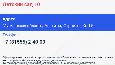 Детский сад №10 по адресу Мурманская область, Апатиты, Строителей, 19 в дальнейшем Организация, размещена в следующих категориях: