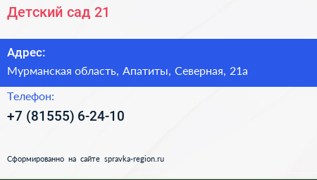 Детский сад №21 по адресу Мурманская область, Апатиты, Северная, 21а в дальнейшем Организация, размещена в следующих категориях: