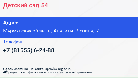 Детский сад №54 по адресу Мурманская область, Апатиты, Ленина, 7 в дальнейшем Организация, размещена в следующих категориях: