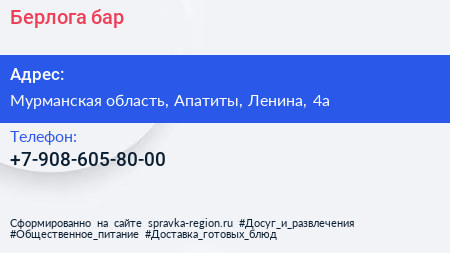 Берлога, бар по адресу Мурманская область, Апатиты, Ленина, 4а в дальнейшем Организация, размещена в следующих категориях: