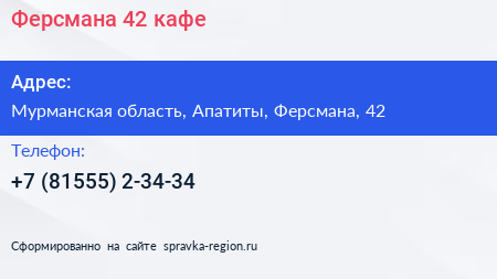 Ферсмана 42, кафе по адресу Мурманская область, Апатиты, Ферсмана, 42 в дальнейшем Организация, размещена в следующих категориях: