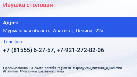 Ивушка, столовая по адресу Мурманская область, Апатиты, Ленина, 22а в дальнейшем Организация, размещена в следующих категориях: