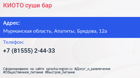 КИОТО, суши-бар по адресу Мурманская область, Апатиты, Бредова, 12а в дальнейшем Организация, размещена в следующих категориях: