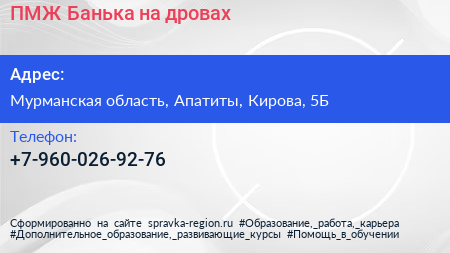 ПМЖ Банька на дровах по адресу Мурманская область, Апатиты, Кирова, 5Б в дальнейшем Организация, размещена в следующих категориях: