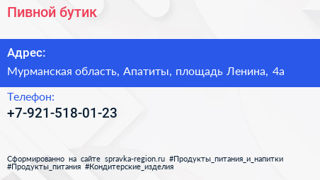 Пивной бутик по адресу Мурманская область, Апатиты, площадь Ленина, 4а в дальнейшем Организация, размещена в следующих категориях: