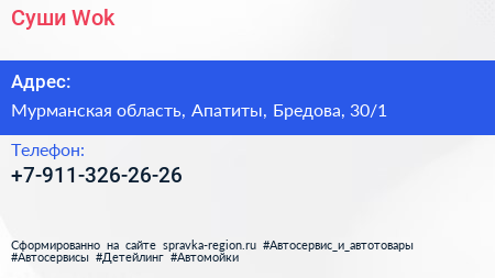 Суши Wok по адресу Мурманская область, Апатиты, Бредова, 30/1 в дальнейшем Организация, размещена в следующих категориях: