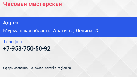 Часовая мастерская по адресу Мурманская область, Апатиты, Ленина, 3 в дальнейшем Организация, размещена в следующих категориях: