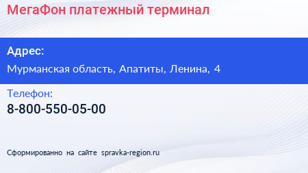 МегаФон, платежный терминал по адресу Мурманская область, Апатиты, Ленина, 4 в дальнейшем Организация, размещена в следующих категориях: