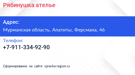 Рябинушка, ателье по адресу Мурманская область, Апатиты, Ферсмана, 46 в дальнейшем Организация, размещена в следующих категориях: