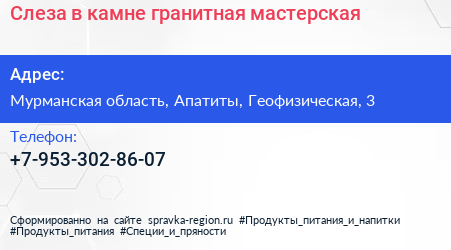 Слеза в камне, гранитная мастерская по адресу Мурманская область, Апатиты, Геофизическая, 3 в дальнейшем Организация, размещена в следующих категориях: