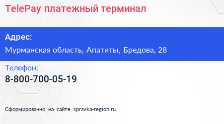 TelePay, платежный терминал по адресу Мурманская область, Апатиты, Бредова, 28 в дальнейшем Организация, размещена в следующих категориях: