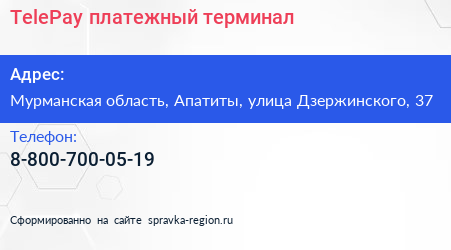 TelePay, платежный терминал по адресу Мурманская область, Апатиты, улица Дзержинского, 37 в дальнейшем Организация, размещена в следующих категориях: