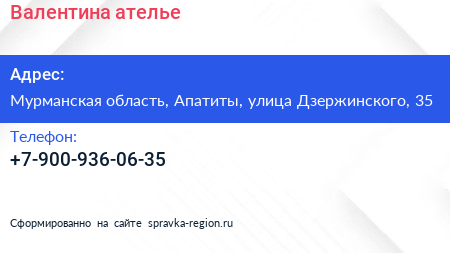 Валентина, ателье по адресу Мурманская область, Апатиты, улица Дзержинского, 35 в дальнейшем Организация, размещена в следующих категориях: