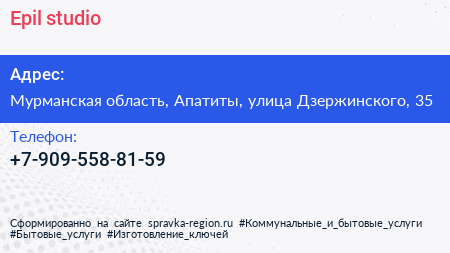 Epil studio по адресу Мурманская область, Апатиты, улица Дзержинского, 35 в дальнейшем Организация, размещена в следующих категориях: