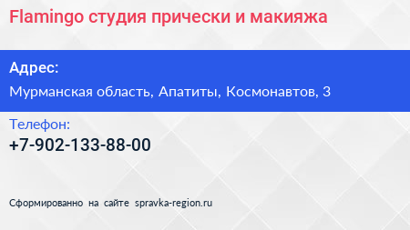 Flamingo, студия прически и макияжа по адресу Мурманская область, Апатиты, Космонавтов, 3 в дальнейшем Организация, размещена в следующих категориях: