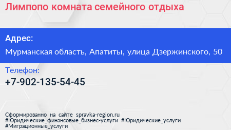 Лимпопо, комната семейного отдыха по адресу Мурманская область, Апатиты, улица Дзержинского, 50 в дальнейшем Организация, размещена в следующих категориях: