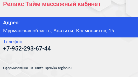 Релакс & Тайм, массажный кабинет по адресу Мурманская область, Апатиты, Космонавтов, 15 в дальнейшем Организация, размещена в следующих категориях: