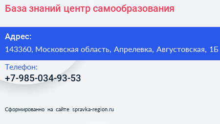 База знаний, центр самообразования по адресу 143360, Московская область, Апрелевка, Августовская, 1Б в дальнейшем Организация, размещена в следующих категориях: