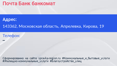 Почта Банк, банкомат по адресу 143362, Московская область, Апрелевка, Кирова, 19 в дальнейшем Организация, размещена в следующих категориях: