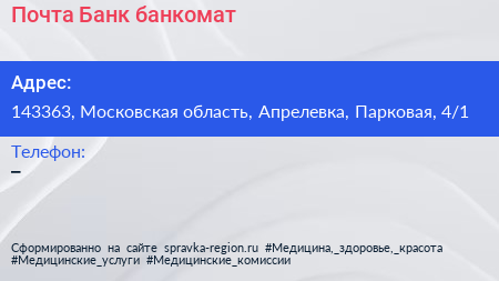 Почта Банк, банкомат по адресу 143363, Московская область, Апрелевка, Парковая, 4/1 в дальнейшем Организация, размещена в следующих категориях: