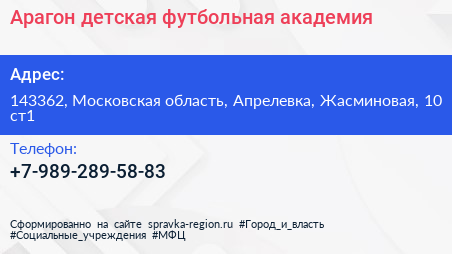 Арагон, детская футбольная академия по адресу 143362, Московская область, Апрелевка, Жасминовая, 10 ст1 в дальнейшем Организация, размещена в следующих категориях: