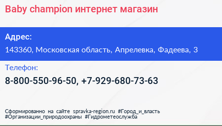 Baby-champion, интернет-магазин по адресу 143360, Московская область, Апрелевка, Фадеева, 3 в дальнейшем Организация, размещена в следующих категориях: