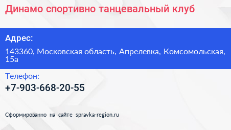 Динамо, спортивно-танцевальный клуб по адресу 143360, Московская область, Апрелевка, Комсомольская, 15а в дальнейшем Организация, размещена в следующих категориях: