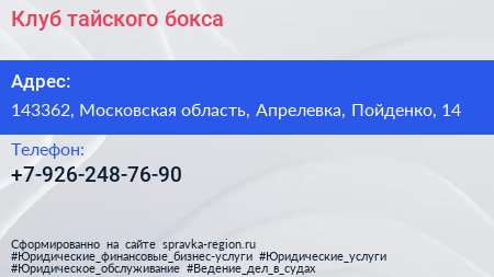 Клуб тайского бокса по адресу 143362, Московская область, Апрелевка, Пойденко, 14 в дальнейшем Организация, размещена в следующих категориях: